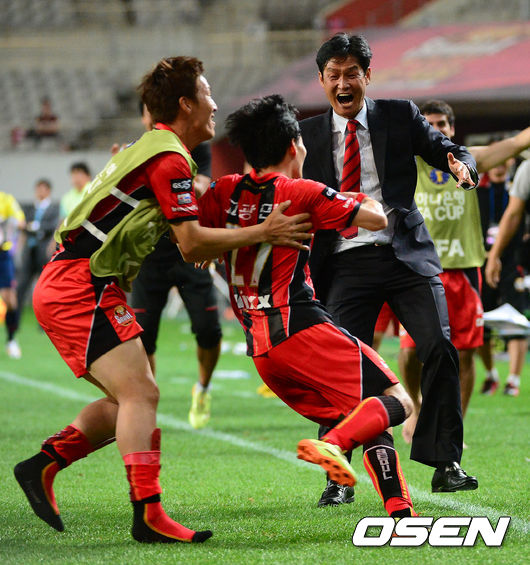 연장 후반 서울 고광민이 역전골을 넣고 최용수 감독과 기뻐하고 있다.