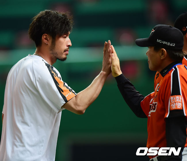 경기를 마치고 한화 김경언이 코치진들과 하이파이브를 하고 있다. / rumi@osen.co.kr