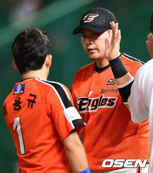 경기를 마치고 한화 김태완과 이용규가 하이파이브를 하고 있다. / rumi@osen.co.kr