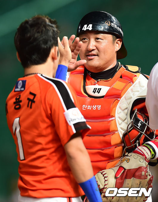 경기를 마치고 한화 조인성과 이용규가 하이파이브를 하고 있다. / rumi@osen.co.kr