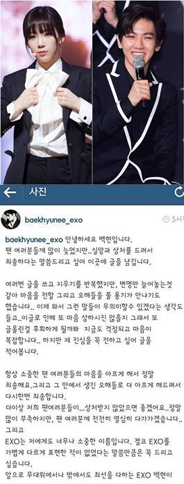 이어 백현은 "항상 소중한 팬 여러분들의 마음을 아프게 해서 정말 죄송해요. 그리고 그 안에서 생긴 오해들로 더 아프게 해드려서 다시 한 번 죄송합니다"라고 거듭 사과하며 "더 이상 저희 팬여러분들이 상처받지 않았으면 좋겠어요. 정말 많이 부족하지만 팬 여러분께 천천히 열심히 다가가겠습니다"라고 밝혔다.