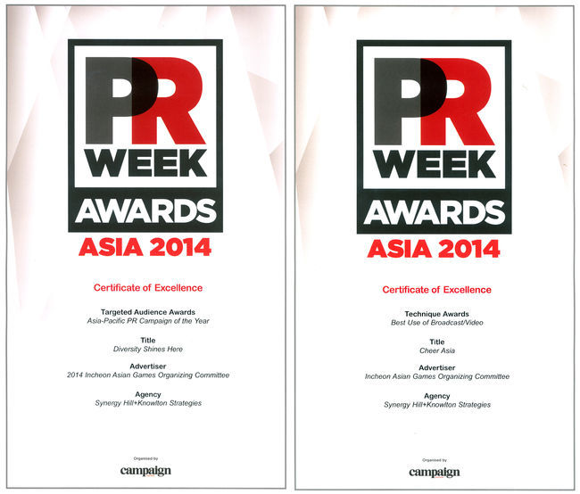 2014 인천아시아경기대회 조직위원회(위원장 김영수)의 해외 홍보 캠페인 'Cheer Asia!'(아시아를 춤추게 하자)가 지난 6월 26일 홍콩에서 열린 ‘PR 위크 아시아 2014’(PR Week Awards Asia)에서 2개 부문 최우수상을 수상했다.