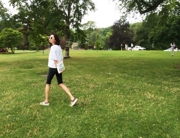 공개된 사진 속 장윤주는 현재 촬영차 체류 중인 캐나다의 한적한 공원을 배경으로 자연스럽게 걷고 있다. 편안한 흰 티셔츠와 검은 반바지로 깔끔한 패션센스를 자랑한다. 흰색 뿔테 선글라스 역시 돋보인다. 그는 이 사진에서도 '모태완벽몸매'를 자랑하고 있다.