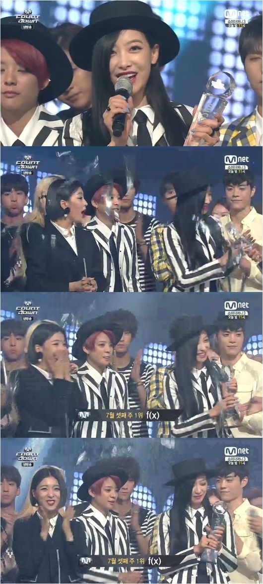 에프엑스가 ‘엠카운트다운’에서 감기 몸살로 아쉽게 무대에 오르지 못한 설리의 아쉬움을 털어버리는 1위를 차지했다.