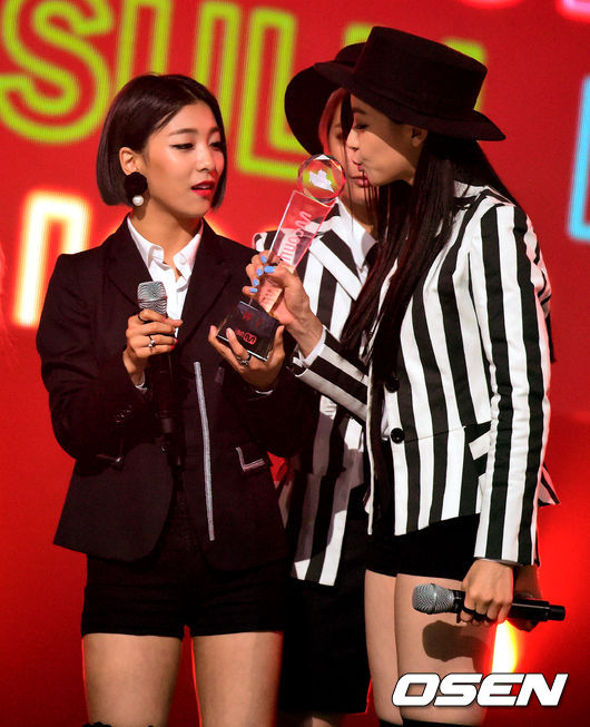 그룹 에프엑스 f(x)가 17일 오후 서울 상암동 CJ E & M에서 진행된 Mnet '엠카운트다운'(이하 엠카) 생방송에서 앙코르 무대를 선보이며 트로피에 키스를 하고 있다.