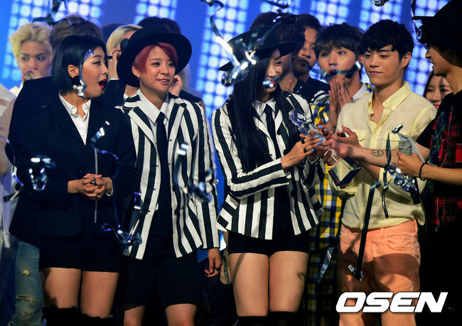 그룹 에프엑스 f(x)가 17일 오후 서울 상암동 CJ E & M에서 진행된 Mnet '엠카운트다운'(이하 엠카) 생방송에서 1위를 차지하며 트로피를 건네받고 있다.