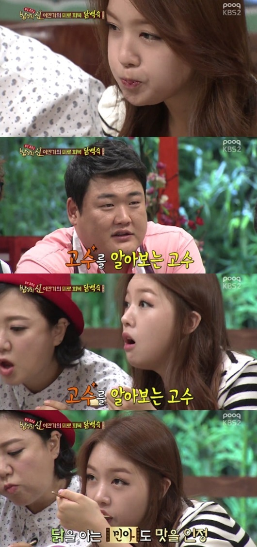 민아는 17일 방송된 KBS 2TV 예능프로그램 '밥상의 신'에 출연해 닭 요리와 관련한 이야기를 나누고, 시식하는 시간을 가졌다.