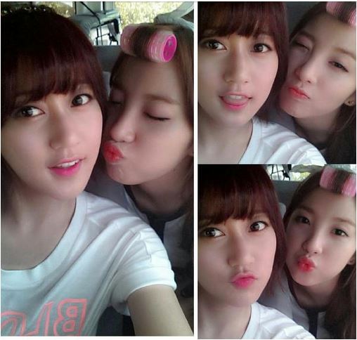 공개된 사진 속 승아와 지숙은 다정한 포즈를 취하며 카메라를 응시하고 있다. 승아의 깜찍한 표정과 지숙의 앞머리 부분에 감긴 헤어롤이 인상적이다.