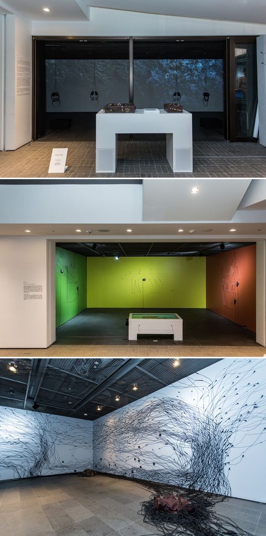 또한 영상 앞의 '가방사운드 악기'라는 설치작품에서는 테이블 위에 스피커와 엠프, 마이크를 장착하고 그 위에 가방의 재료가 되는 제작 도구들을 마찰시켜 관객이 직접 리듬을 생산할 수 있게 했다.
