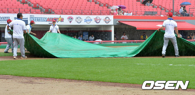 2회말 우천으로 인해 진행요원들이 방수포를 덮고 있다.