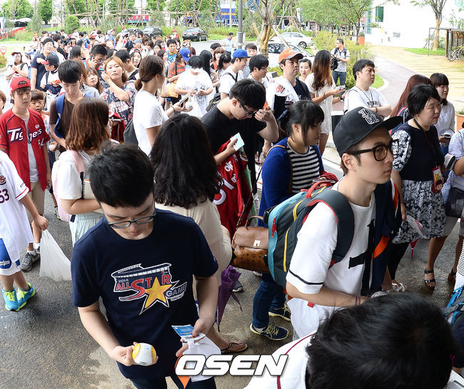 18일 오후 광주 광주-기아 챔피언스 필드에서 열리는 '2014 한국야쿠르트 세븐 프로야구 올스타전'에 앞서 야구팬들이 경기 시작을 기다리고 있다.
