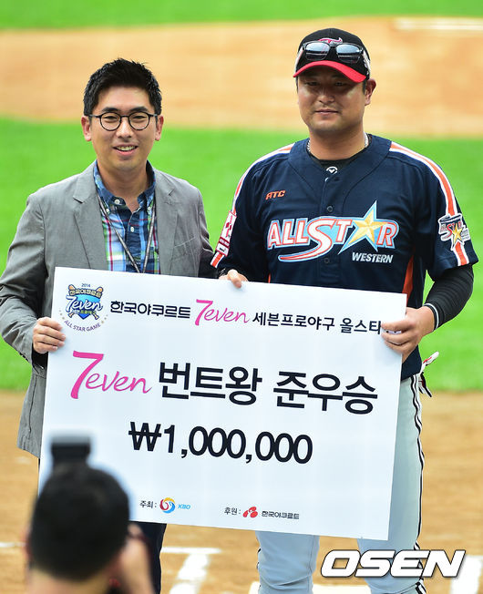 18일 오후 광주 광주-기아 챔피언스 필드에서 열리는 '2014 한국야쿠르트 세븐 프로야구 올스타전', 세븐 번트왕 행사에서 준우승자 최경철이 수상을 하고 있다.