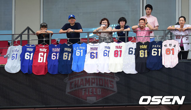 18일 오후 광주 광주-기아 챔피언스 필드에서 '2014 한국야쿠르트 세븐 프로야구 올스타전'이 열리는 가운데 관중석에 박찬호의 유니폼이 걸려 있다.