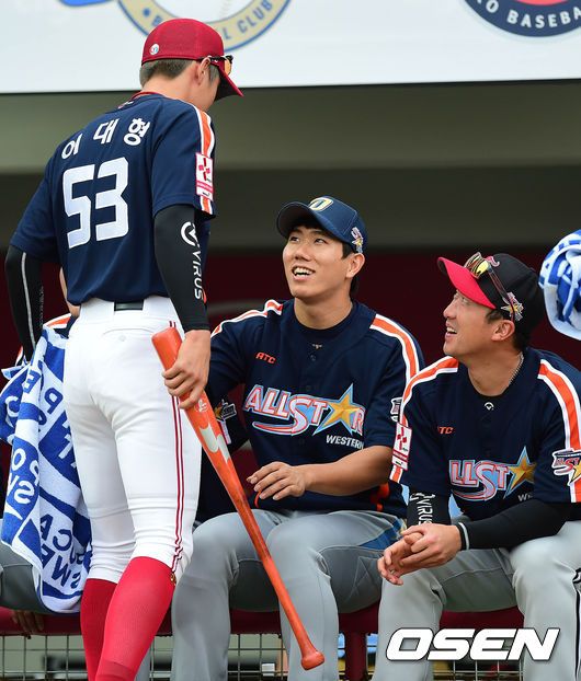18일 오후 광주 광주-기아 챔피언스 필드에서 열린 '2014 한국야쿠르트 세븐 프로야구 올스타전' 번트왕 대회에서 이대형과 모창민이 이야기를 나누고 있다.