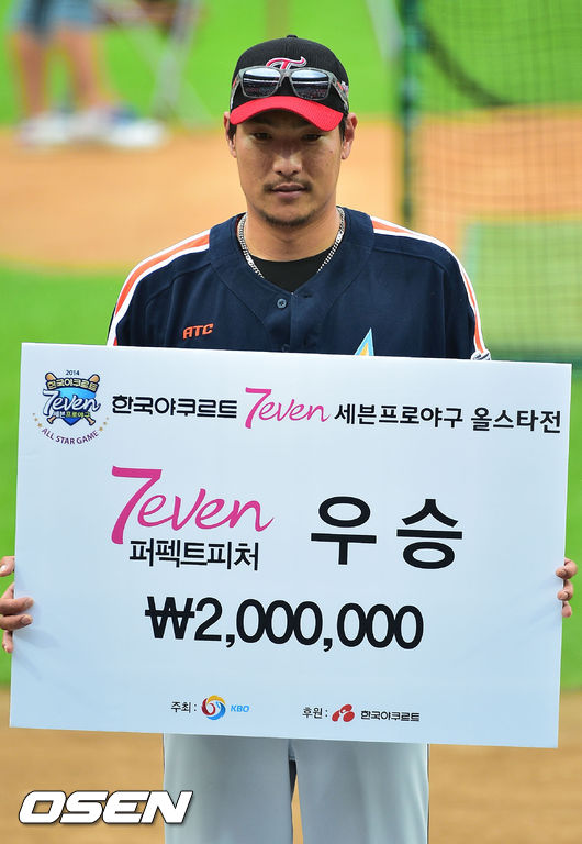 18일 오후 광주 광주-기아 챔피언스 필드에서 열리는 '2014 한국야쿠르트 세븐 프로야구 올스타전', 퍼펙트 피처 행사에서 우승한 LG 이동현이 수상하고 있다.