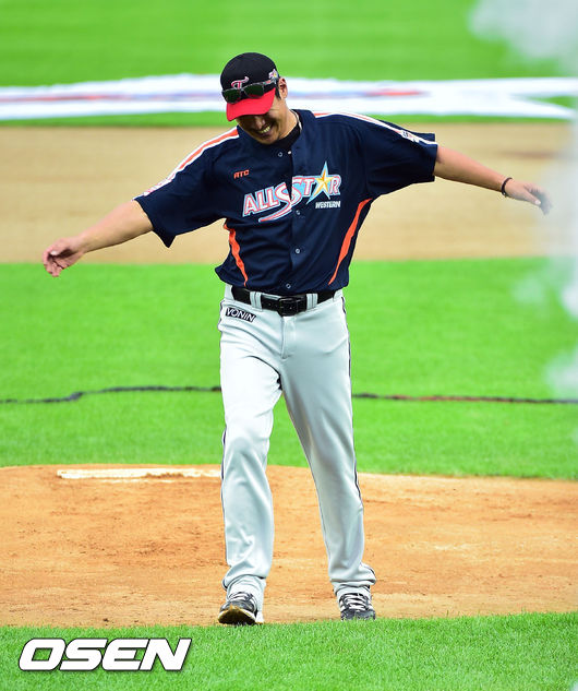 18일 오후 광주 광주-기아 챔피언스 필드에서 열리는 '2014 한국야쿠르트 세븐 프로야구 올스타전', 퍼펙트 피처 행사에서 우승한 LG 이동현이 미소 짓고 있다