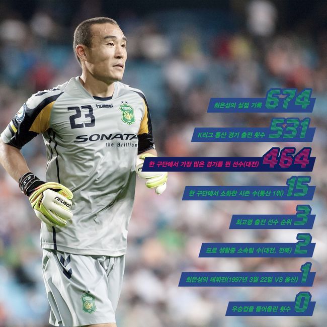 최은성은 현재까지 대전과 전북을 거치며 K리그 통산 531경기에 출전했다. 'K리그 러브레터 2.0'은 아름다운 은퇴식을 준비중인 최은성의 K리그 기록들을 숫자로 풀어봤다.