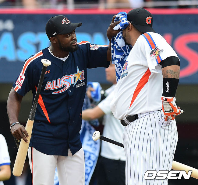 18일 오후 광주 광주-기아 챔피언스 필드에서 열린 '2014 한국야쿠르트 세븐 프로야구 올스타전' 홈런레이스 대회, 피에가 히메네스의 땀을 닦아주고 있다.