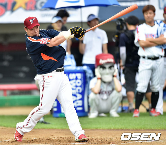 18일 오후 광주 광주-기아 챔피언스 필드에서 열리는 '2014 한국야쿠르트 세븐 프로야구 올스타전'에 앞서 서군 나지완이 홈런왕 대회에서 타격을 하고 있다.