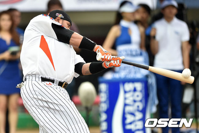 18일 오후 광주 광주-기아 챔피언스 필드에서 열리는 '2014 한국야쿠르트 세븐 프로야구 올스타전'에 앞서 동군 히메네스가 홈런왕 대회에서 타격을 하고 있다.
