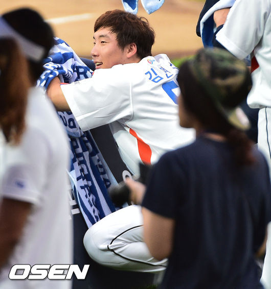 18일 오후 광주 광주-기아 챔피언스 필드에서 열리는 '2014 한국야쿠르트 세븐 프로야구 올스타전', 홈런레에스 결승전에서 두산 김현수가 이재원의 홈런레이스에 긴장하고 있다.
