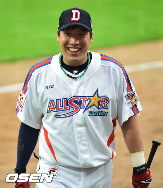 18일 오후 광주 광주-기아 챔피언스 필드에서 열리는 '2014 한국야쿠르트 세븐 프로야구 올스타전', 홈런레에스 결승전에서 두산 김현수가 미소 짓고 있다.