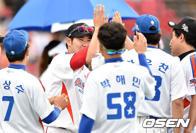 18일 오후 광주 광주-기아 챔피언스 필드에서 열리는 '2014 한국야쿠르트 세븐 프로야구 올스타전'에 앞서 이재원이 홈런왕 대회를 마치고 동료들과 환호하고 있다.