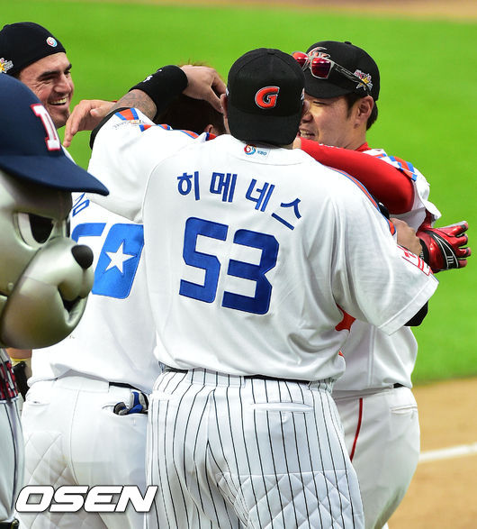 18일 오후 광주 광주-기아 챔피언스 필드에서 열리는 '2014 한국야쿠르트 세븐 프로야구 올스타전', 홈런레이스에서 홈런왕을 확정지은 두산 김현수가 기뻐하고 있다.