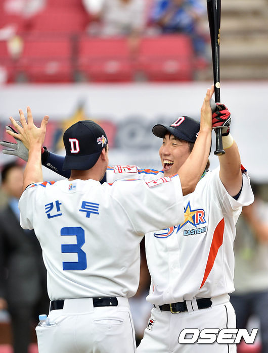 18일 오후 광주 광주-기아 챔피언스 필드에서 열리는 '2014 한국야쿠르트 세븐 프로야구 올스타전'에 앞서 홈런왕을 확정지은 김현수가 칸투와 환호하고 있다.