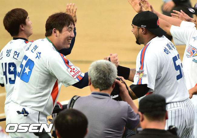 18일 오후 광주 광주-기아 챔피언스 필드에서 열리는 '2014 한국야쿠르트 세븐 프로야구 올스타전', 홈런레이스에서 홈런왕을 확정지은 두산 김현수가 기뻐하고 있다.