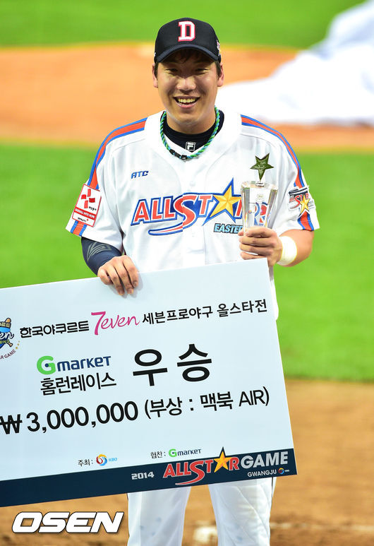 18일 오후 광주 광주-기아 챔피언스 필드에서 열리는 '2014 한국야쿠르트 세븐 프로야구 올스타전', 홈런레이스에서 우승한 두산 김현수가 수상을 하며 포즈를 취하고 있다.