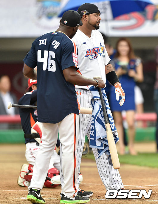 18일 오후 광주 광주-기아 챔피언스 필드에서 열리는 '2014 한국야쿠르트 세븐 프로야구 올스타전'에 앞서 열린 홈런왕 대회에서 피에가 히메네스에게 다른 배트를 건네고 있다.
