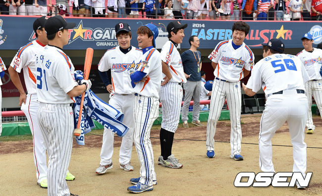 18일 오후 광주 광주-기아 챔피언스 필드에서 열리는 '2014 한국야쿠르트 세븐 프로야구 올스타전'에 앞서 올스타 선수들이 미소를 지으며 이야기를 나누고 있다.