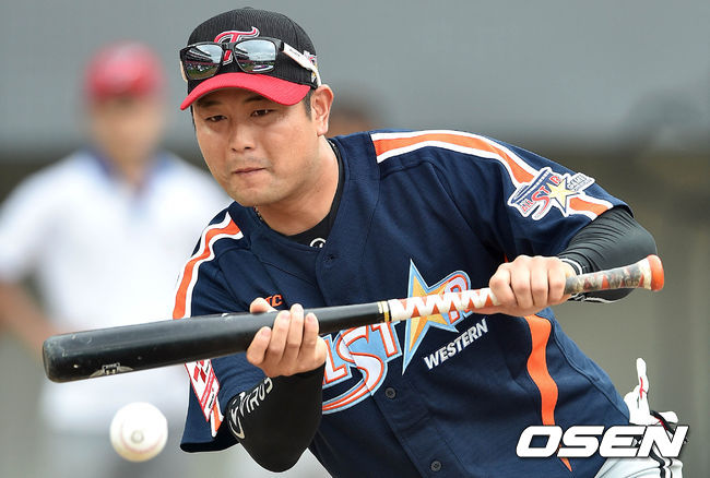 18일 오후 광주 광주-기아 챔피언스 필드에서 열리는 '2014 한국야쿠르트 세븐 프로야구 올스타전'에 앞서 열린 번트왕 대회에서 최경철이 번트를 하고 있다.