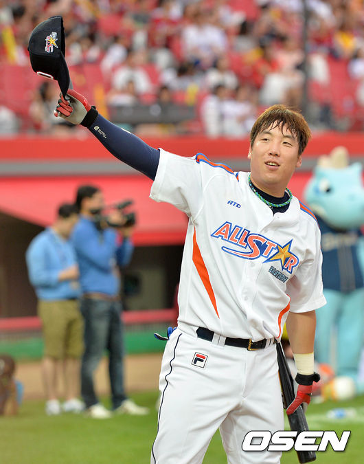 18일 오후 광주 광주-기아 챔피언스 필드에서 열리는 '2014 한국야쿠르트 세븐 프로야구 올스타전'에 앞서 열린 홈런왕 대회에서 홈런왕을 확정지은 김현수가 팬들에게 인사를 하고 있다.