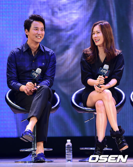 배우 김남길, 손예진이 무대에서 미소짓고 있다.