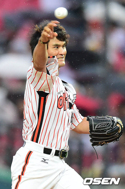 18일 오후 광주 광주-기아 챔피언스 필드에서 열린 '2014 한국야쿠르트 세븐 프로야구 올스타전' 시작전 박찬호가 시구를 하고 있다.