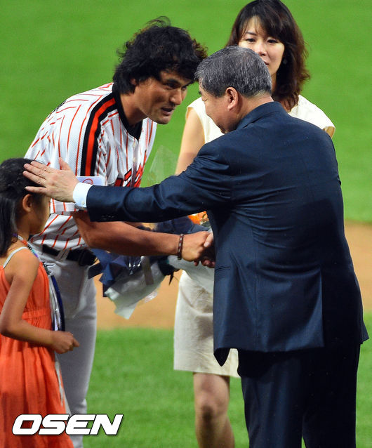 18일 오후 광주 광주-기아 챔피언스 필드에서 열리는 '2014 한국야쿠르트 세븐 프로야구 올스타전'에 앞서 은퇴식을 갖은 박찬호가 구본능 KBO 총재의 축하를 받고 있다