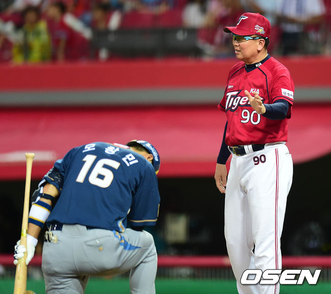 18일 오후 광주 광주-기아 챔피언스 필드에서 열린 '2014 한국야쿠르트 세븐 프로야구 올스타전' 2회초 2사 모창민이 솔로홈런을 치고 홈을 밟는 가운데 선동렬 감독이 홈에서 모창민을 반기고 있다.