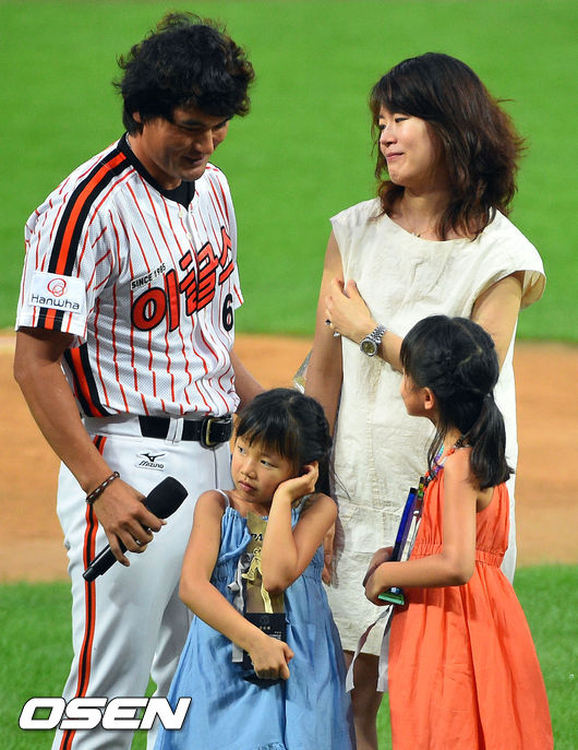 18일 오후 광주 광주-기아 챔피언스 필드에서 열리는 '2014 한국야쿠르트 세븐 프로야구 올스타전' 웨스턴과 이스턴의 경기 은퇴식을 갖은 박찬호가 두딸을 보며 미소 짓고 있다.