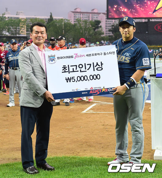 18일 오후 광주 광주-기아 챔피언스 필드에서 열린 '2014 한국야쿠르트 세븐 프로야구 올스타전' 시작전 나성범이 '최고인기상'을 수상하고 있다.