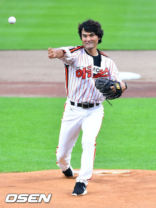 18일 오후 광주 광주-기아 챔피언스 필드에서 열리는 '2014 한국야쿠르트 세븐 프로야구 올스타전' 웨스턴과 이스턴의 경기 박찬호가 시구를 하고 있다.