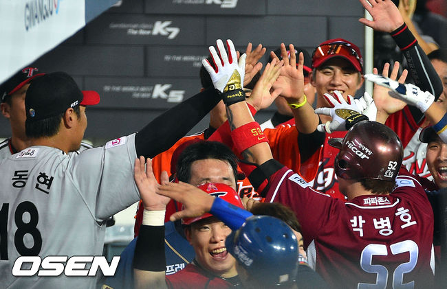 18일 오후 광주 광주-기아 챔피언스 필드에서 열리는 '2014 한국야쿠르트 세븐 프로야구 올스타전' 웨스턴과 이스턴의 경기 3회초 1사 1,3루 웨스턴 박병호가 3점 홈런을 날리고 동료들과 기뻐하고 있다.