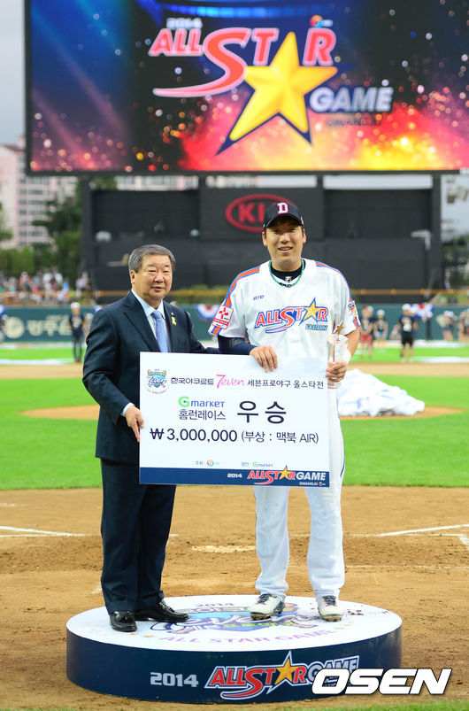18일 오후 광주 광주-기아 챔피언스 필드에서 열린 '2014 한국야쿠르트 세븐 프로야구 올스타전' 홈런레이스에서 우승을 차지한 김현수가 기념촬영을 하고 있다.