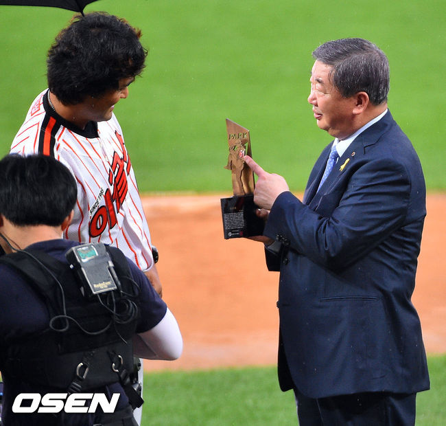 18일 오후 광주 광주-기아 챔피언스 필드에서 열리는 '2014 한국야쿠르트 세븐 프로야구 올스타전' 웨스턴과 이스턴의 경기 박찬호가 KBO 구본능 총재에게 기념 트로피를 받고 있다.