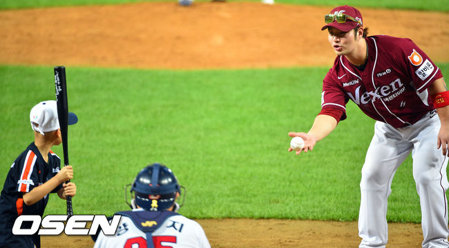 18일 오후 광주 광주-기아 챔피언스 필드에서 열리는 '2014 한국야쿠르트 세븐 프로야구 올스타전' 웨스턴과 이스턴의 경기 백혈병 어린이 희밍 이벤트에서 박병호가 사연 주인공에게 공을 던져주고 있다.