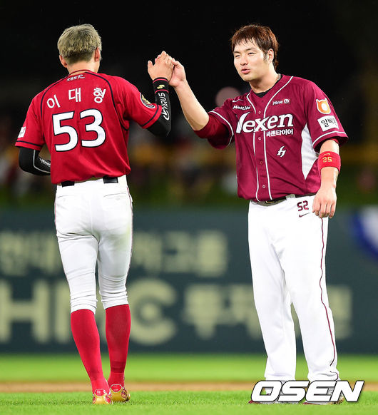 18일 오후 광주 광주-기아 챔피언스 필드에서 열린 '2014 한국야쿠르트 세븐 프로야구 올스타전' 6회 공수교대 시간, 이대형과 박병호가 하이파이브를 하고 있다.