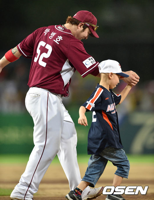 클리닝 타임때 서군 박병호가 백혈병 어린이 희망 이벤트에서 사연의 주인공 박주상 어린이와 그라운드를 돌고 있다.
