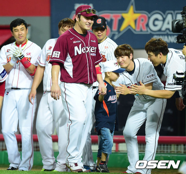 18일 오후 광주 광주-기아 챔피언스 필드에서 열린 '2014 한국야쿠르트 세븐 프로야구 올스타전' 클리닝 타임, 박병호가 백혈병 어린이 희망 이벤트 사연의 주인공인 박주상 어린이와 그라운드를 걷고 있다.