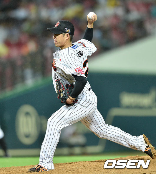 7회초 무사에서 동군 김승회가 힘차게 공을 던지고 있다.